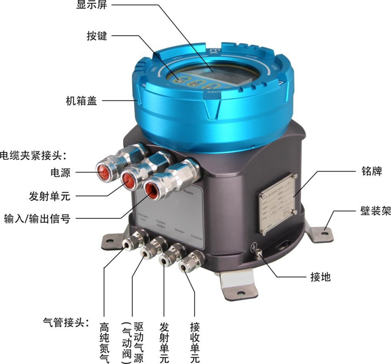 为了防止粉尘和被测环境中其它污染物在视窗上聚集,需用工业氮气等气体通过吹扫入口进行连续吹扫,以便在光学视窗与工业气体间形成一段气幕保护。